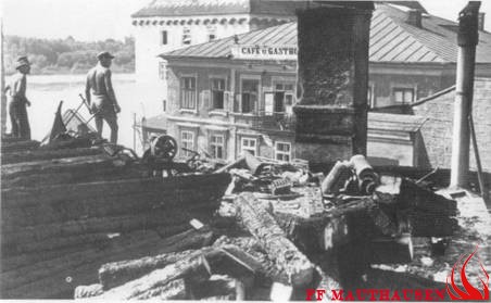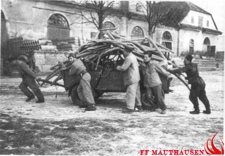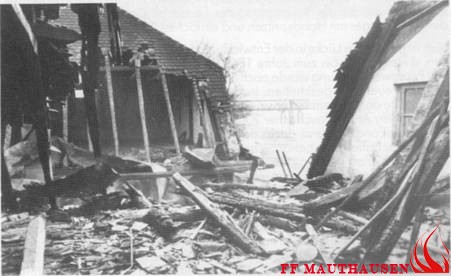 Während des Krieges wurden drei Einsätze bei Bränden in Linz durchgeführt, ein Einsatz in Mauthausen (Bombenangriff auf das Anwesen des Karl Kurz und ein Tieffliegerangriff am Bahnhof Mauthausen). Als 1945 der Krieg zu Ende ging, wurden sämtliche Geräte der Feuerwehr gestohlen, doch gelang es dem rührigen und tatkräftigen Eingreifen der wenigen Mitglieder der Feuerwehr, die noch in Mauthausen geblieben waren (Josef Niederhofer, Hubert Grubauer, Franz Hessl und einige andere), sämtliches Material der Wiener Städtischen Feuerwehr, welche in den letzten Monaten des Krieges statt der SS die Bewachung des Konzentrationslagers übernehmen hatte müssen, sicherzustellen. Es wurden nicht weniger als 16 vollbeladene Lastkraftwagen an Material für die Wiener Städtische Feuerwehr sichergestellt. Auch unsere Feuerwehr hat wieder aufgerüstet, sodass die Ausrüstung unserer Feuerwehr wieder komplett mit drei vollkommen motorisierten Zügen dasteht. Es sei nur erwähnt, dass die Wiener Städtische Berufsfeuerwehr nicht weniger als 16 Mal in Mauthausen war und das Material, welches durch das Eingreifen der hiesigen Feuerwehr sichergestellt werden konnte, abgeholt hat.