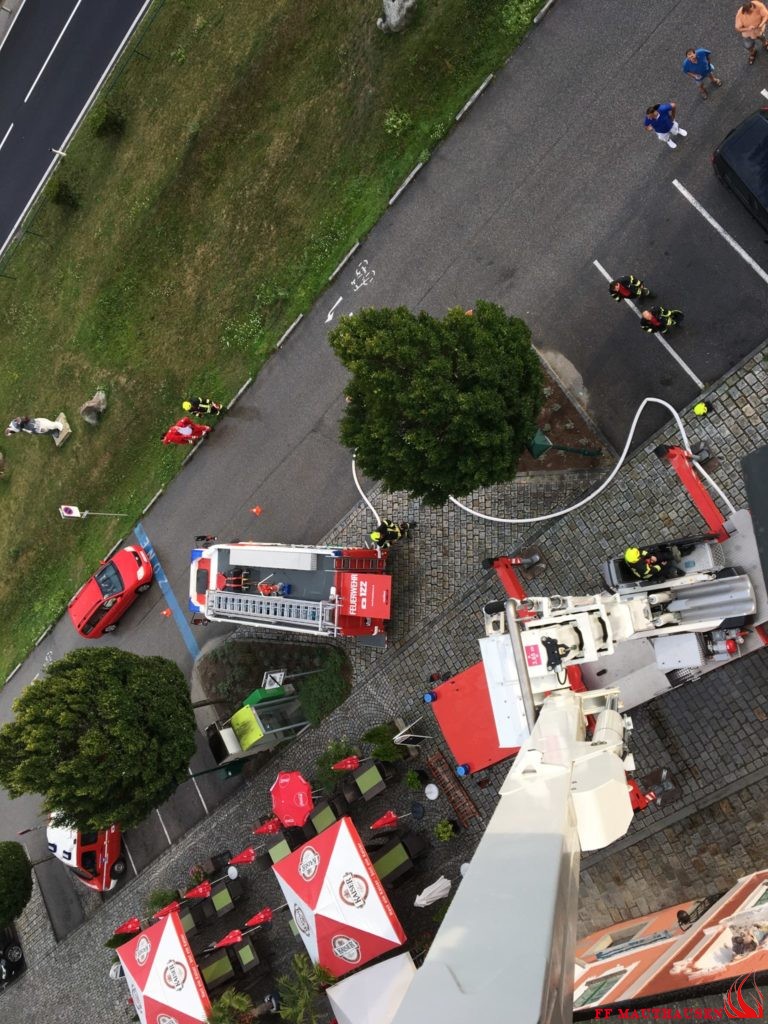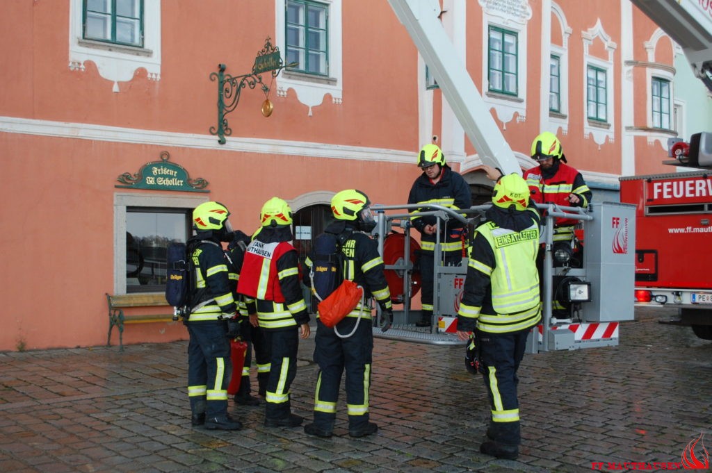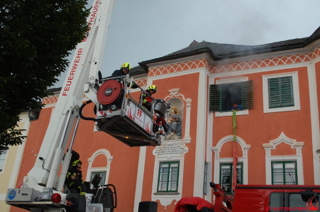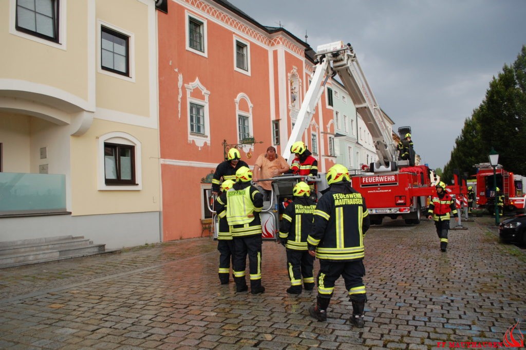 Ein angenommener Dachstuhlbrand im Untermarkt war das Thema der August-Monatsübung. Bereits beim Eintreffen der ersten Fahrzeuge waren Hilferufe aus dem Fenster des verrauchten 2. Stocks zu hören. Die Menschenrettung und Brandbekämpfung wurde über die TMB, die vom TLF mit Wasser versorgt wurde, vorgenommen. Eine weitere zu rettende Person befand sich auf dem Dach.