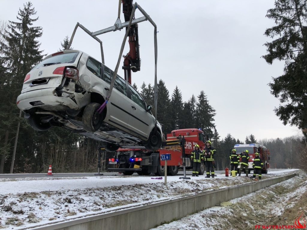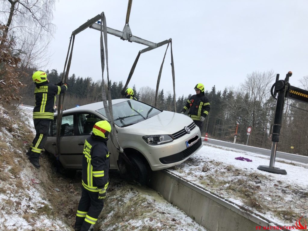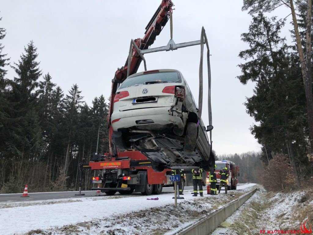 Heute Vormittag wurde die FF Mauthausen mit dem Kranfahrzeug zu einer Pkw Bergung auf der B123 in die Gemeinde Ried in der Riedmark durch die FF Altaist/Hartl alarmiert.