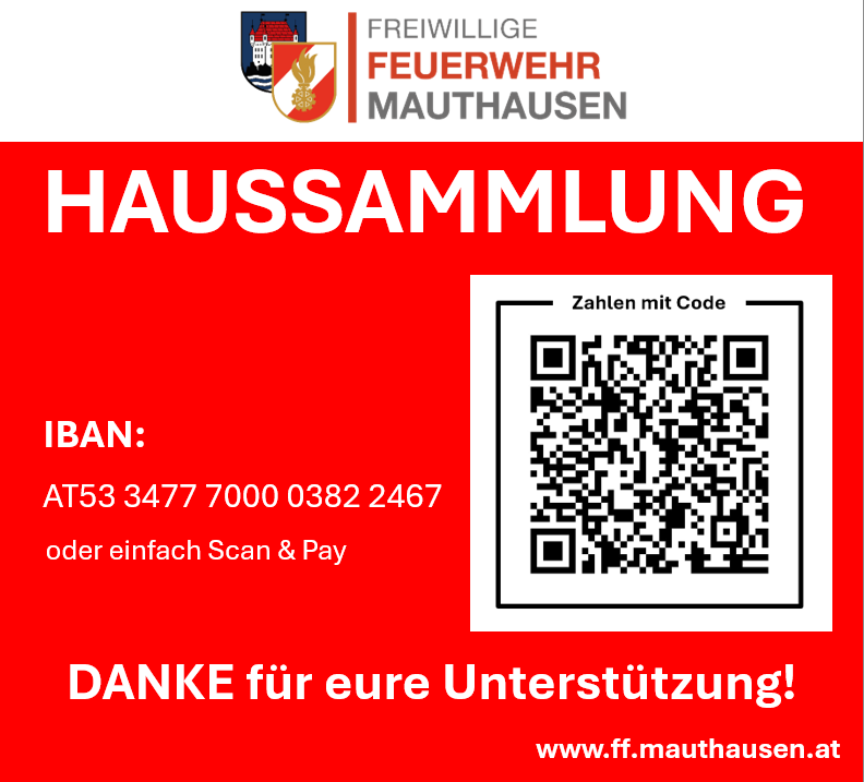 Sollten wir Sie bei der diesjährigen Haussammlung nicht angetroffen haben und Sie dennoch einen wertvollen Beitrag für die Freiwillige Feuerwehr Mauthausen leisten wollen, ist eine Spende auf folgendes Konto jederzeit möglich. IBAN: AT53 3477 7000 0382 2467
