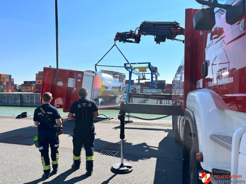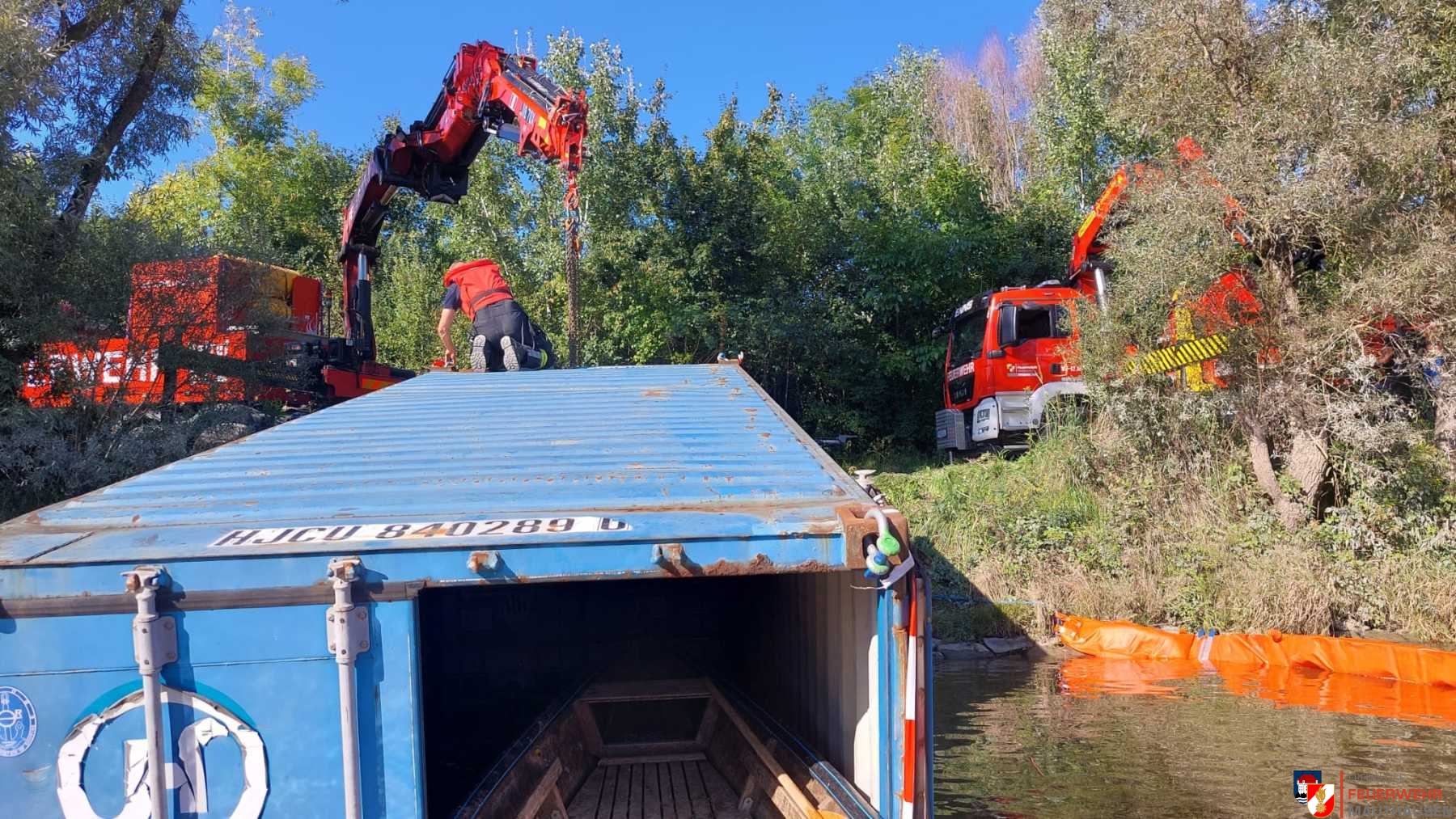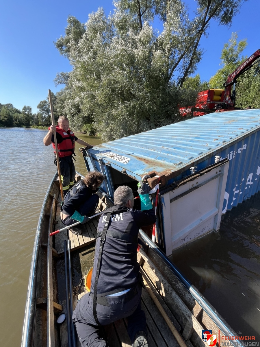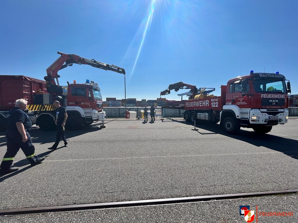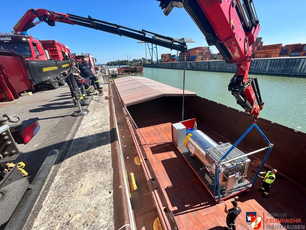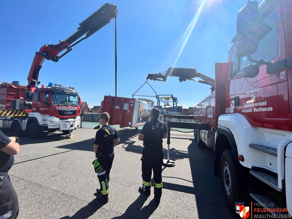 Ein Schiffscontainer, beladen mit giftigen Chemikalien, stürzte in die Donau, so die Übungsannahme in Mauthausen. Wir setzten die bei uns in Mauthausen stationierten Ölsperren um eine weitere Ausbreitung der Chemikalien in der Donau zu verhindern. Gemeinsam mit Einsatzkräften aus Frankreich, Holland und Rumänien wurden Wasserproben gezogen und analysiert. Die A-Boote der Feuerwehren Mauthausen und Luftenberg übernahmen zusätzlich Transportfahrten nach Abwinden wo ebenso Proben von giftigen Chemikalien gezogen wurden und zusätzlich noch zwei verletzte Personen gerettet werden mussten. Die ebenso anwesenden Feuerwehrtaucher aus St. Georgen an der Gusen sorgten dabei für Sicherheit und standen auf Bereitschaft. Zuletzt wurde noch der in die Donau gestürzte Schiffscontainer mit den Feuerwehrkränen von Mauthausen und Enns mittels Tandemhub aus der Donau geborgen.