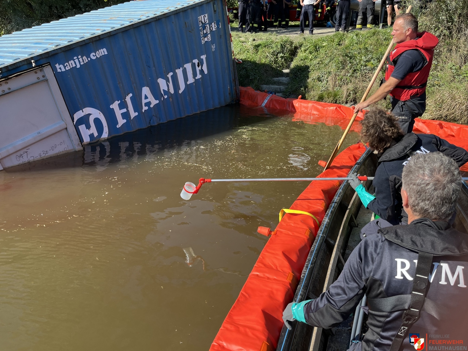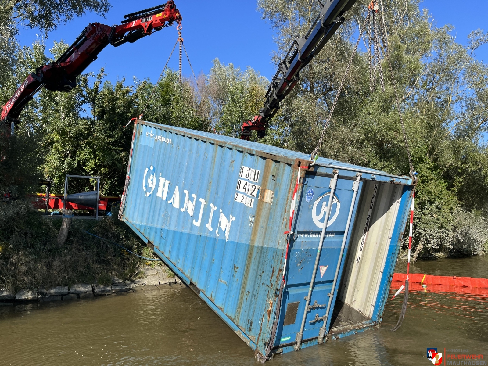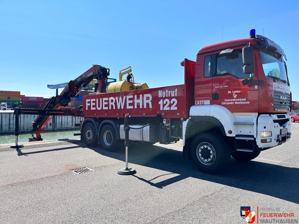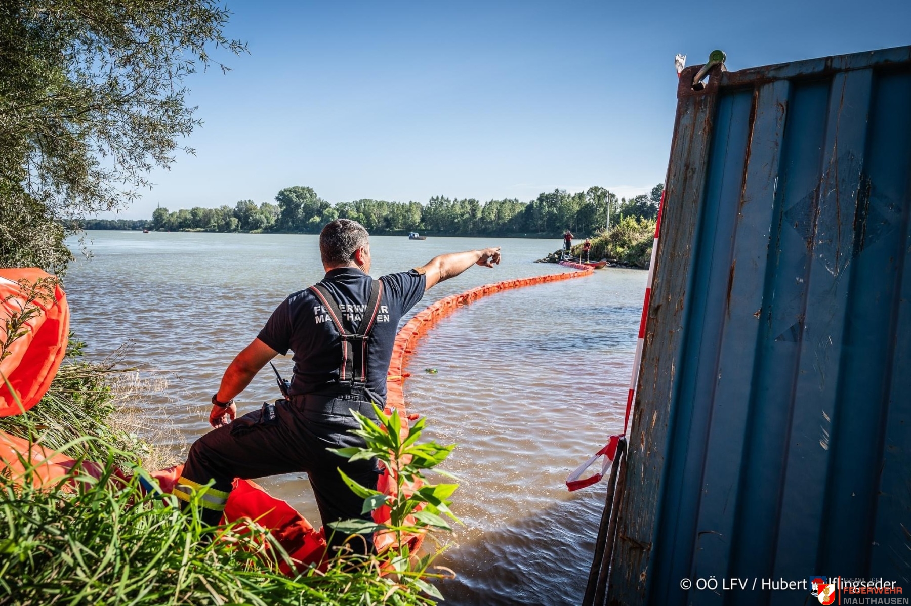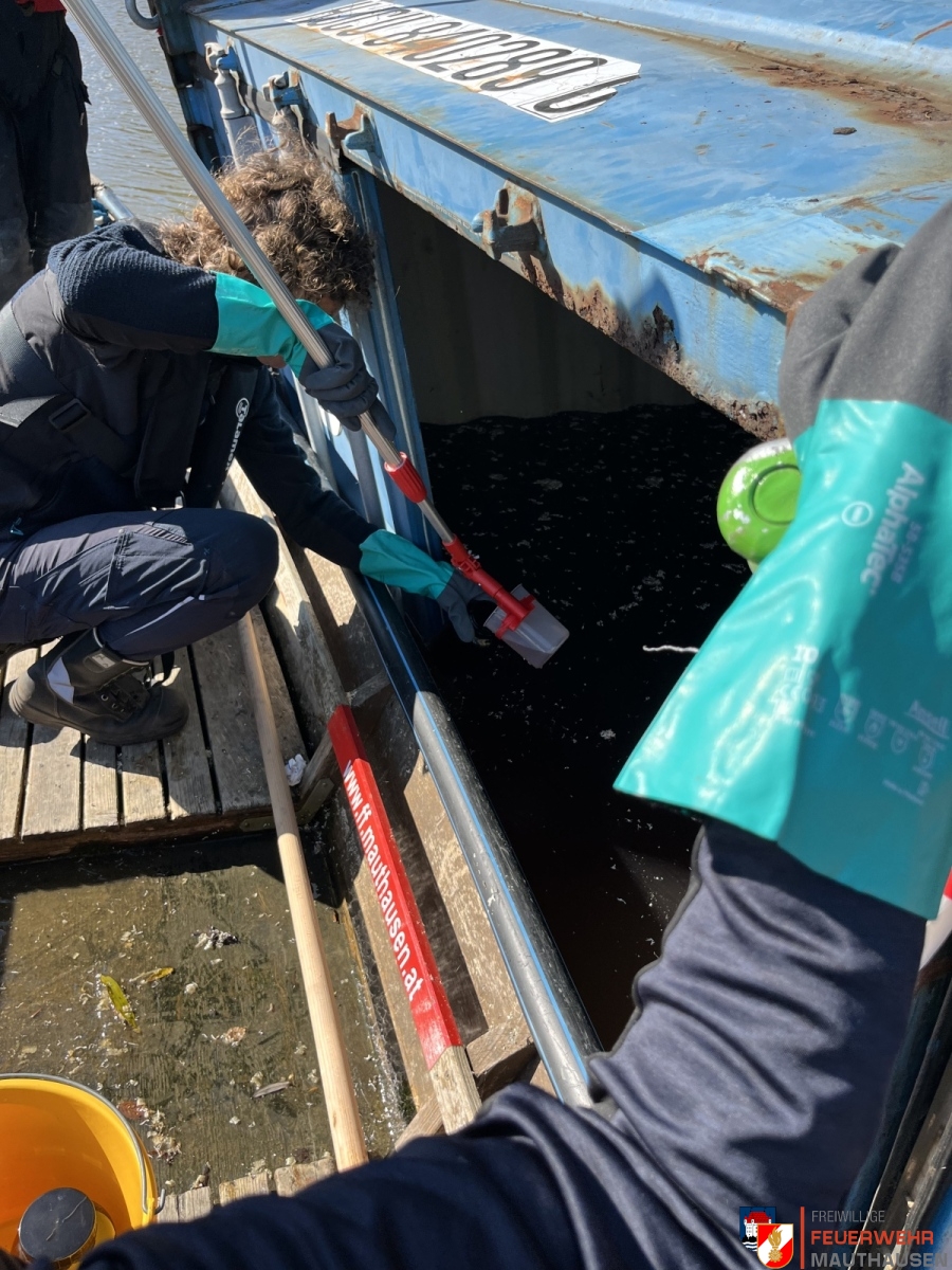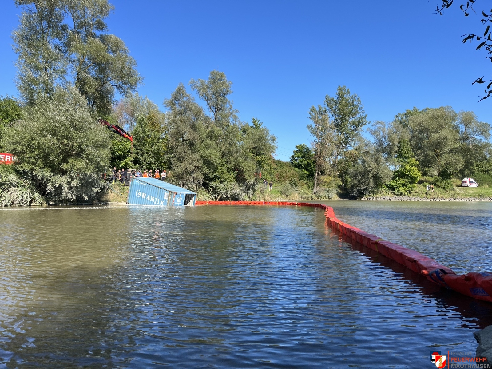Ein Schiffscontainer, beladen mit giftigen Chemikalien, stürzte in die Donau, so die Übungsannahme in Mauthausen. Wir setzten die bei uns in Mauthausen stationierten Ölsperren um eine weitere Ausbreitung der Chemikalien in der Donau zu verhindern. Gemeinsam mit Einsatzkräften aus Frankreich, Holland und Rumänien wurden Wasserproben gezogen und analysiert. Die A-Boote der Feuerwehren Mauthausen und Luftenberg übernahmen zusätzlich Transportfahrten nach Abwinden wo ebenso Proben von giftigen Chemikalien gezogen wurden und zusätzlich noch zwei verletzte Personen gerettet werden mussten. Die ebenso anwesenden Feuerwehrtaucher aus St. Georgen an der Gusen sorgten dabei für Sicherheit und standen auf Bereitschaft. Zuletzt wurde noch der in die Donau gestürzte Schiffscontainer mit den Feuerwehrkränen von Mauthausen und Enns mittels Tandemhub aus der Donau geborgen.