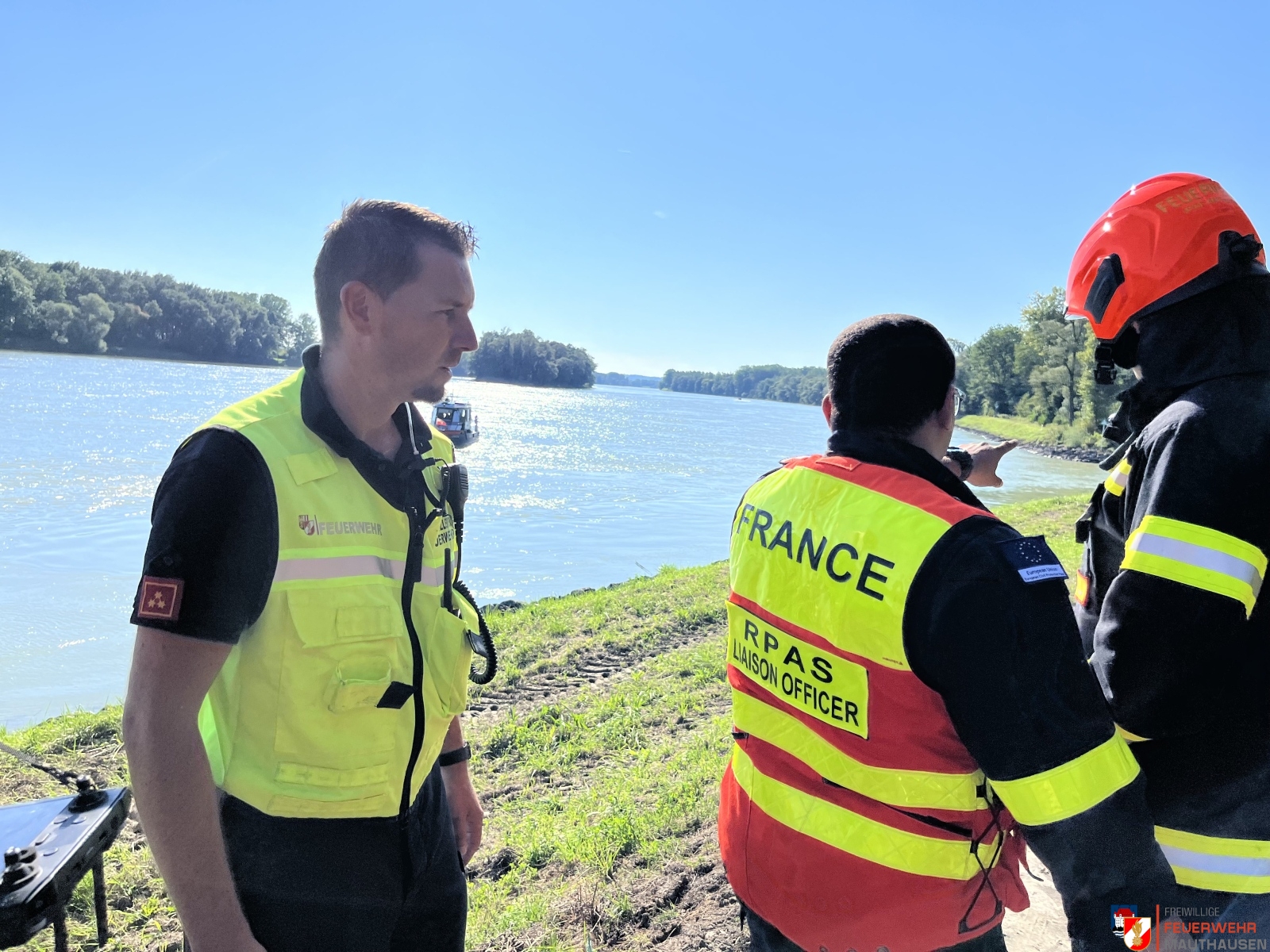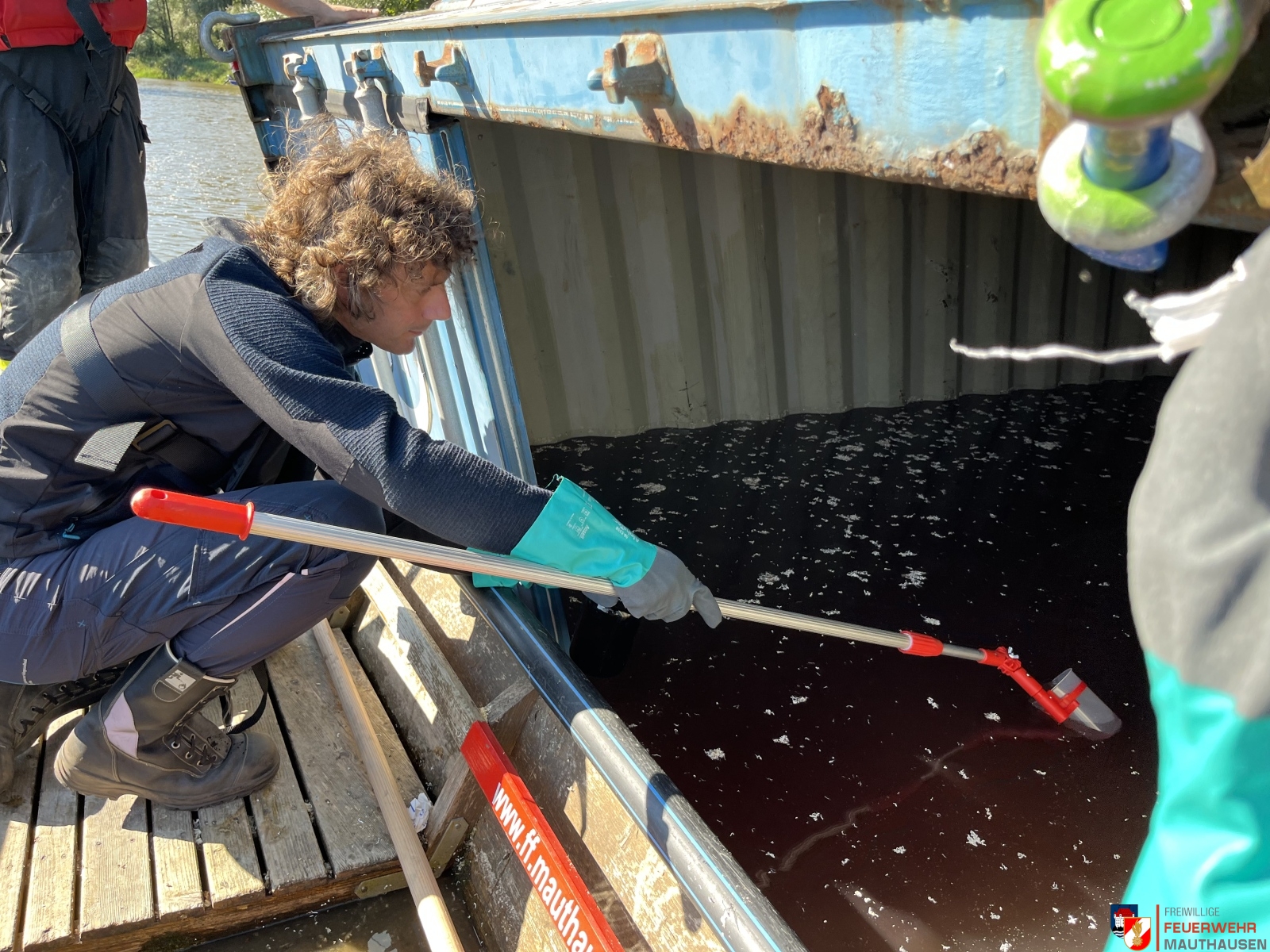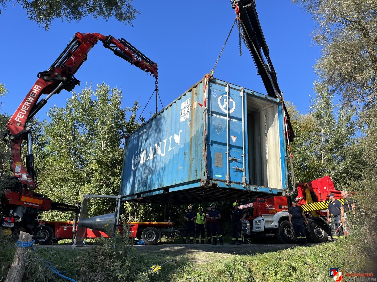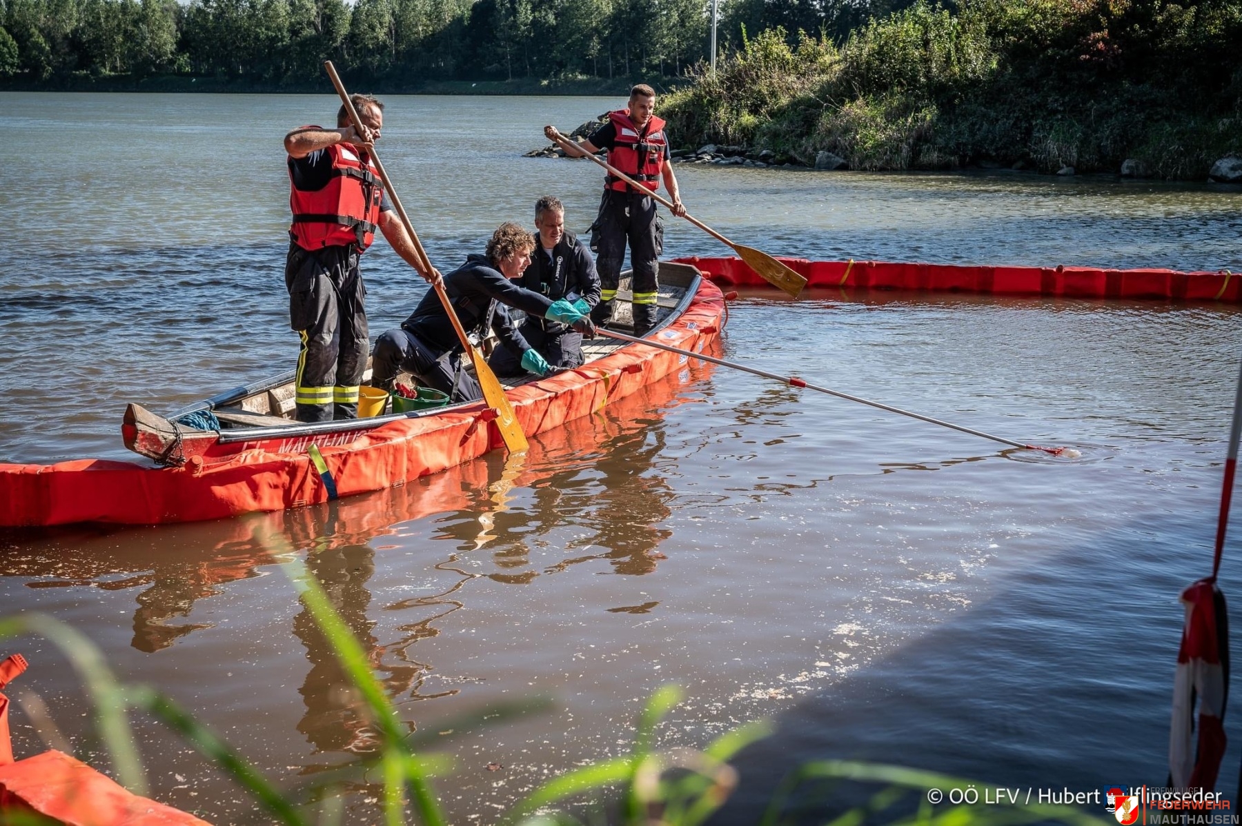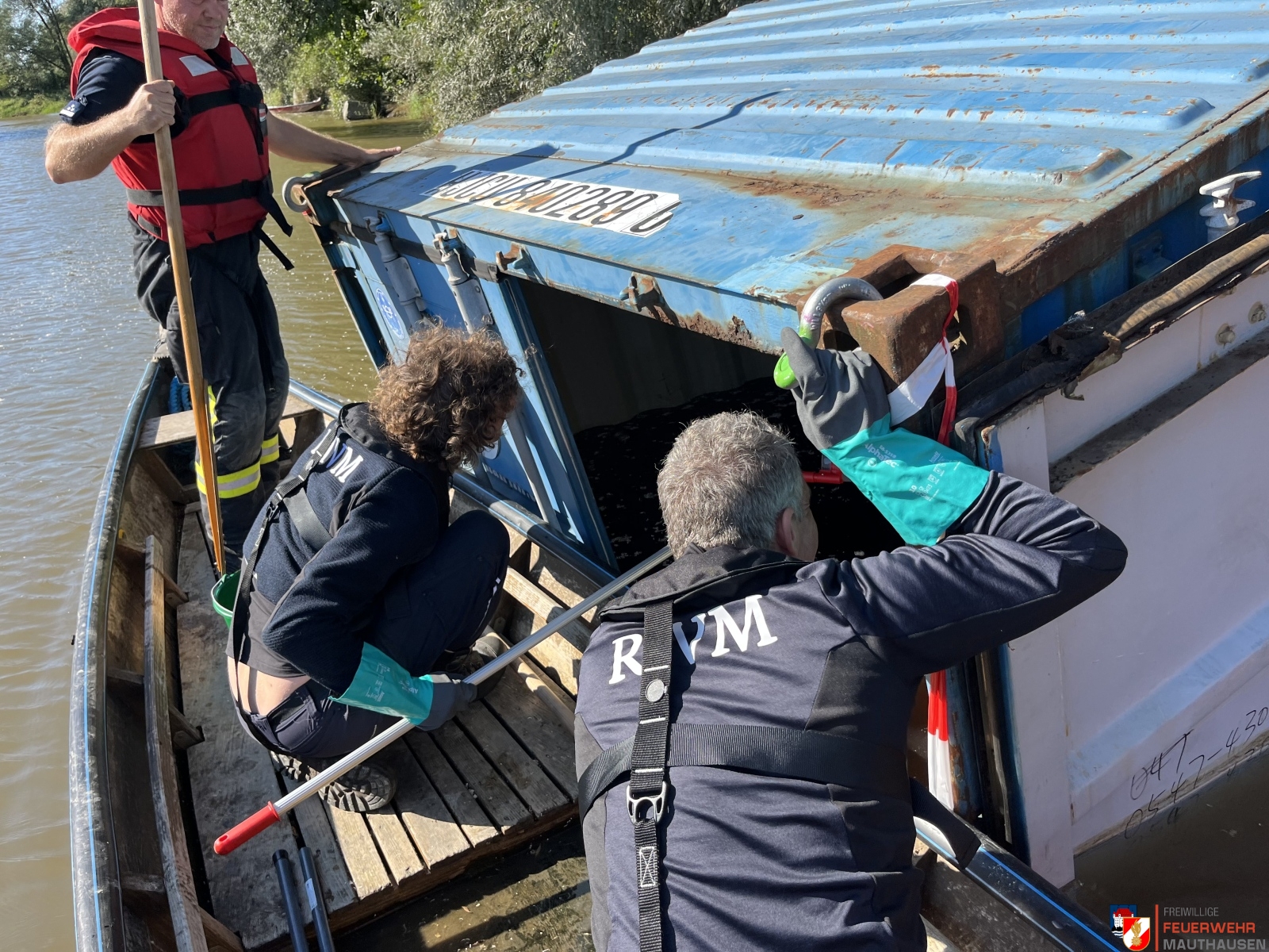 Ein Schiffscontainer, beladen mit giftigen Chemikalien, stürzte in die Donau, so die Übungsannahme in Mauthausen. Wir setzten die bei uns in Mauthausen stationierten Ölsperren um eine weitere Ausbreitung der Chemikalien in der Donau zu verhindern. Gemeinsam mit Einsatzkräften aus Frankreich, Holland und Rumänien wurden Wasserproben gezogen und analysiert. Die A-Boote der Feuerwehren Mauthausen und Luftenberg übernahmen zusätzlich Transportfahrten nach Abwinden wo ebenso Proben von giftigen Chemikalien gezogen wurden und zusätzlich noch zwei verletzte Personen gerettet werden mussten. Die ebenso anwesenden Feuerwehrtaucher aus St. Georgen an der Gusen sorgten dabei für Sicherheit und standen auf Bereitschaft. Zuletzt wurde noch der in die Donau gestürzte Schiffscontainer mit den Feuerwehrkränen von Mauthausen und Enns mittels Tandemhub aus der Donau geborgen.