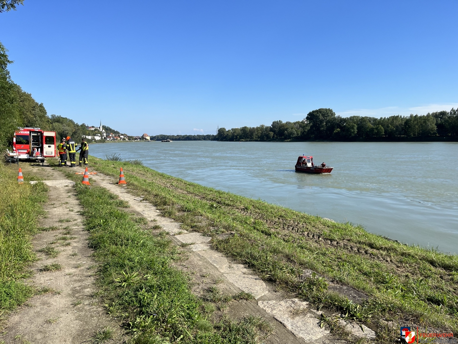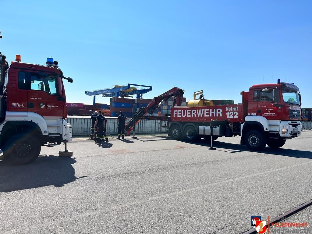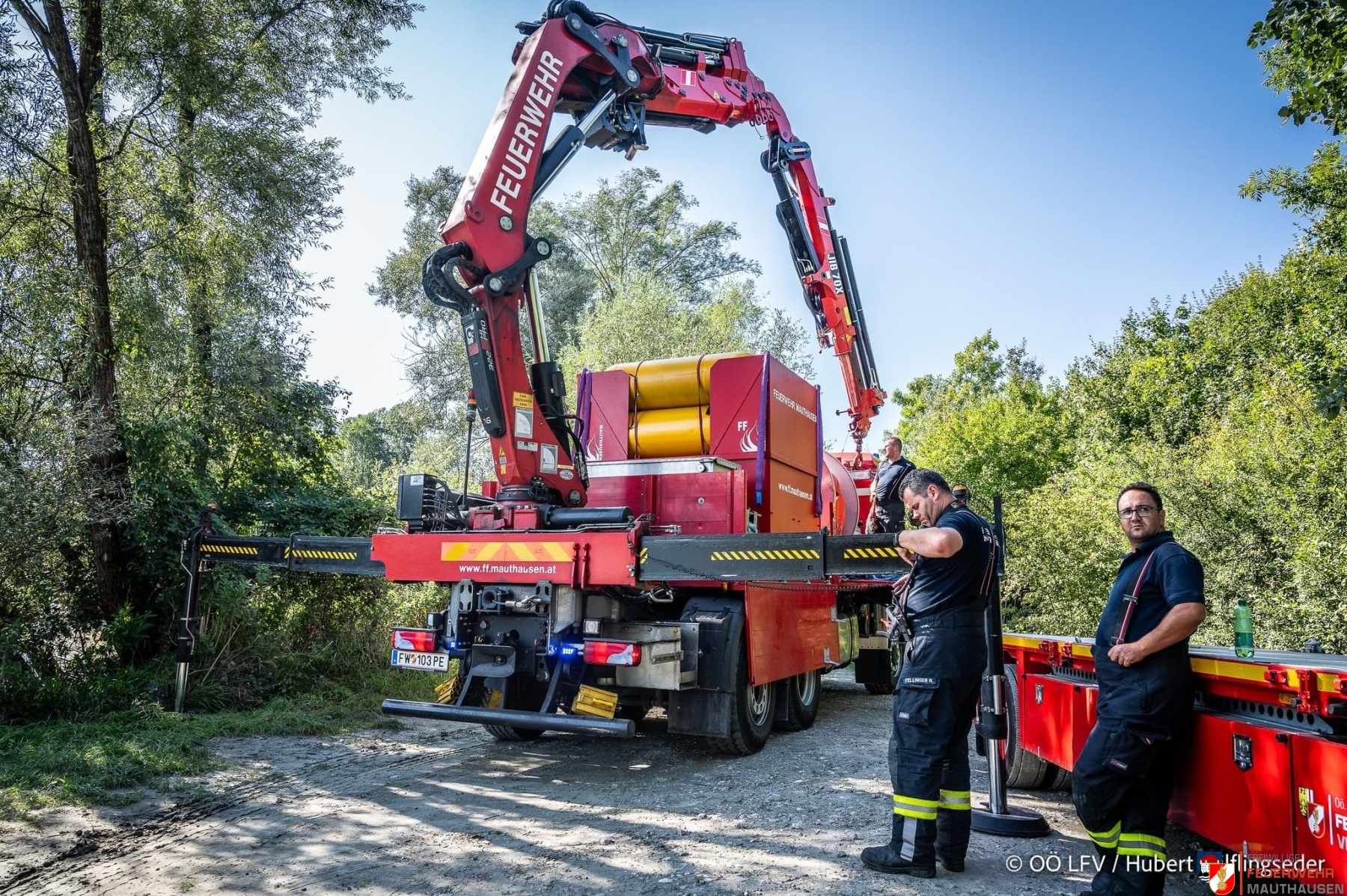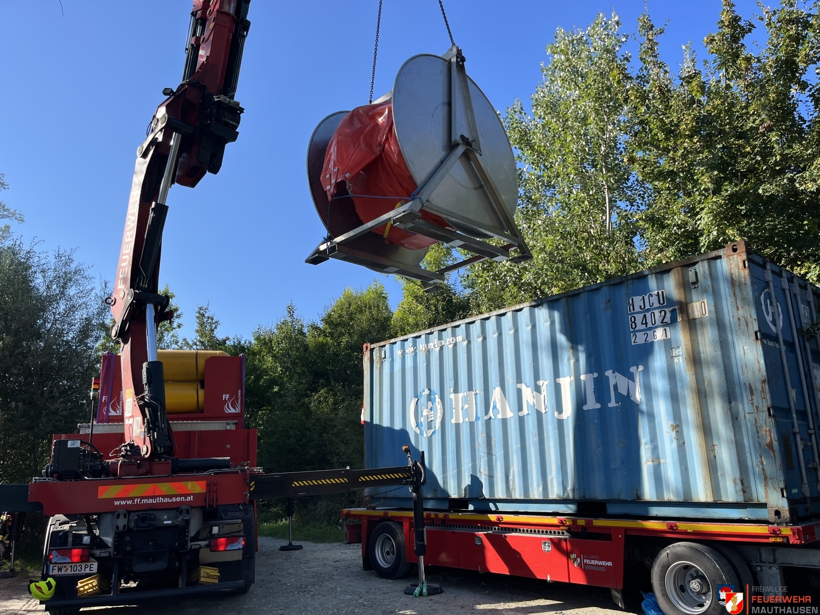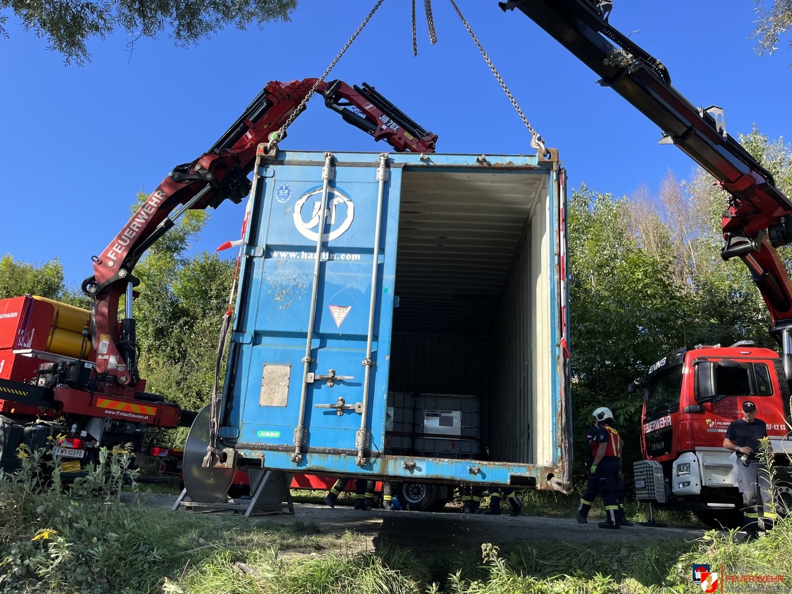 Ein Schiffscontainer, beladen mit giftigen Chemikalien, stürzte in die Donau, so die Übungsannahme in Mauthausen. Wir setzten die bei uns in Mauthausen stationierten Ölsperren um eine weitere Ausbreitung der Chemikalien in der Donau zu verhindern. Gemeinsam mit Einsatzkräften aus Frankreich, Holland und Rumänien wurden Wasserproben gezogen und analysiert. Die A-Boote der Feuerwehren Mauthausen und Luftenberg übernahmen zusätzlich Transportfahrten nach Abwinden wo ebenso Proben von giftigen Chemikalien gezogen wurden und zusätzlich noch zwei verletzte Personen gerettet werden mussten. Die ebenso anwesenden Feuerwehrtaucher aus St. Georgen an der Gusen sorgten dabei für Sicherheit und standen auf Bereitschaft. Zuletzt wurde noch der in die Donau gestürzte Schiffscontainer mit den Feuerwehrkränen von Mauthausen und Enns mittels Tandemhub aus der Donau geborgen.