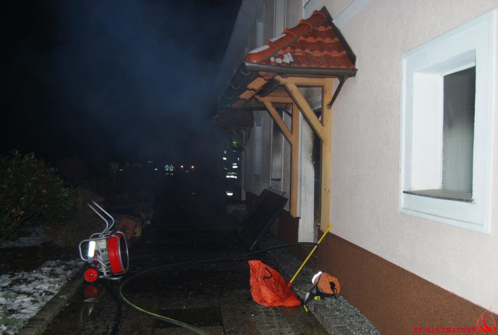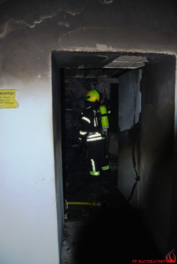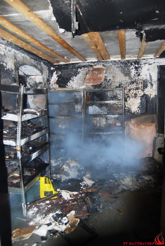 Beim Eintreffen der Feuerwehr stand ein zur Garage anschließender Abstellraum in Vollbrand. Zwei Atemschutztrupps starteten sofort mit einem Löschangriff. Laufende Explosionen von Spraydosen und eine über ein Überdruckventil abblasende Gasflasche erschwerten den Innenangriff der Atemschutztrupps massiv. Ein pensionierter Landwirt konnte leider nur mehr tot geborgen werden.