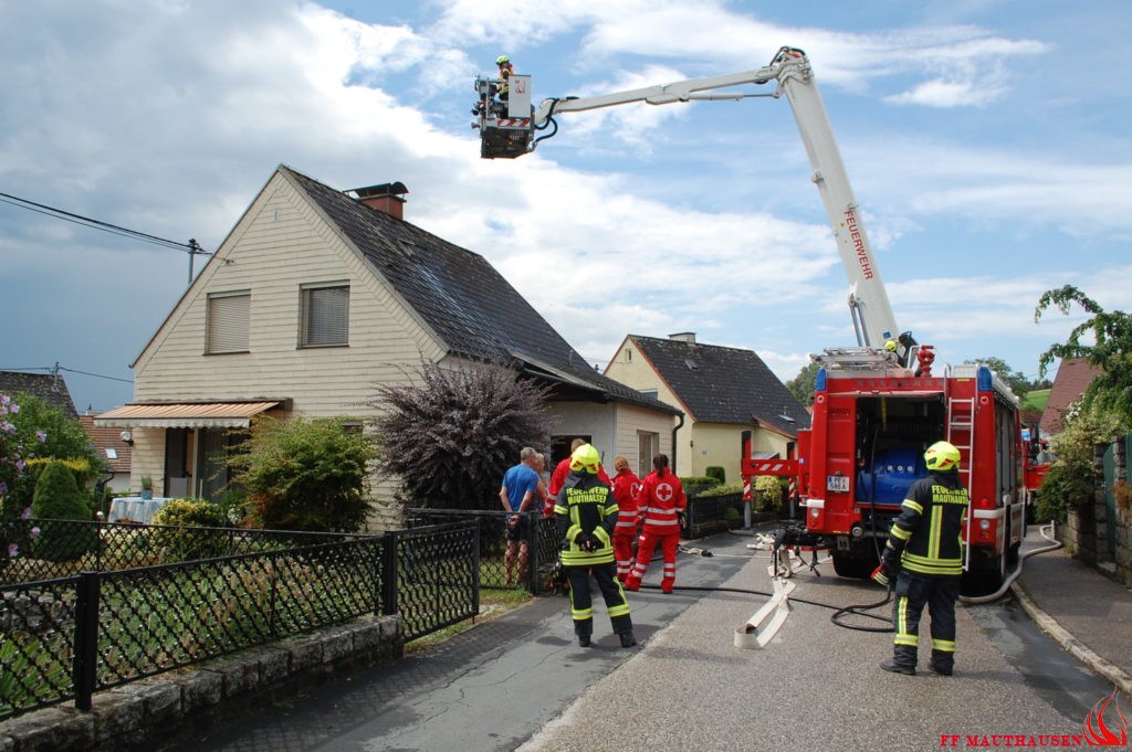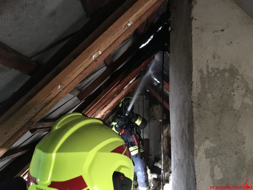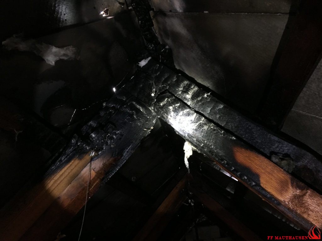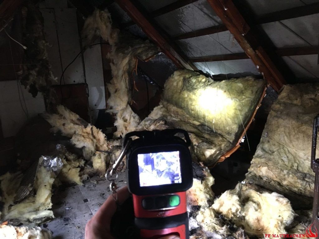 Ein Blitzeinschlag in das Dach eines Einfamilienhauses führte im Malvenweg zu einem Dachstuhlbrand. Durch den raschen Innenangriff des Atemschutztrupps konnte eine weitere Brandausbreitung unter Zuhilfenahme des HD-Schlauches verhindert werden. Nachdem das Dämmmaterial von der Innenseite des Daches entfernt war, wurde der Holzaufbau mittels Wärmebildkamera überprüft.