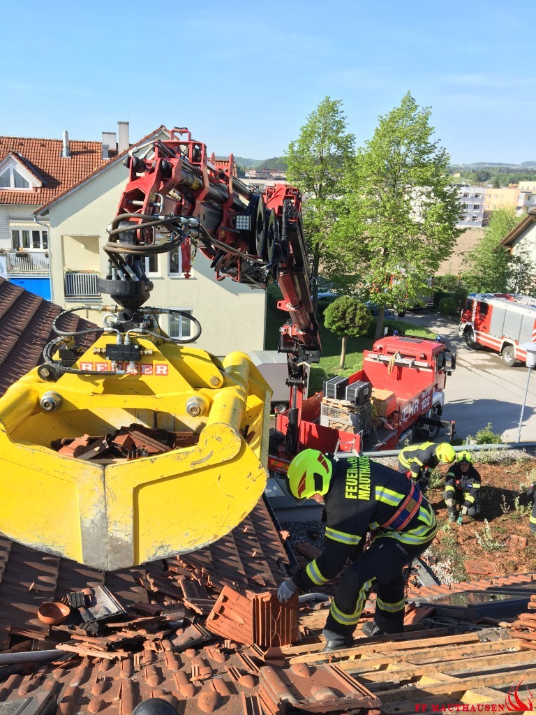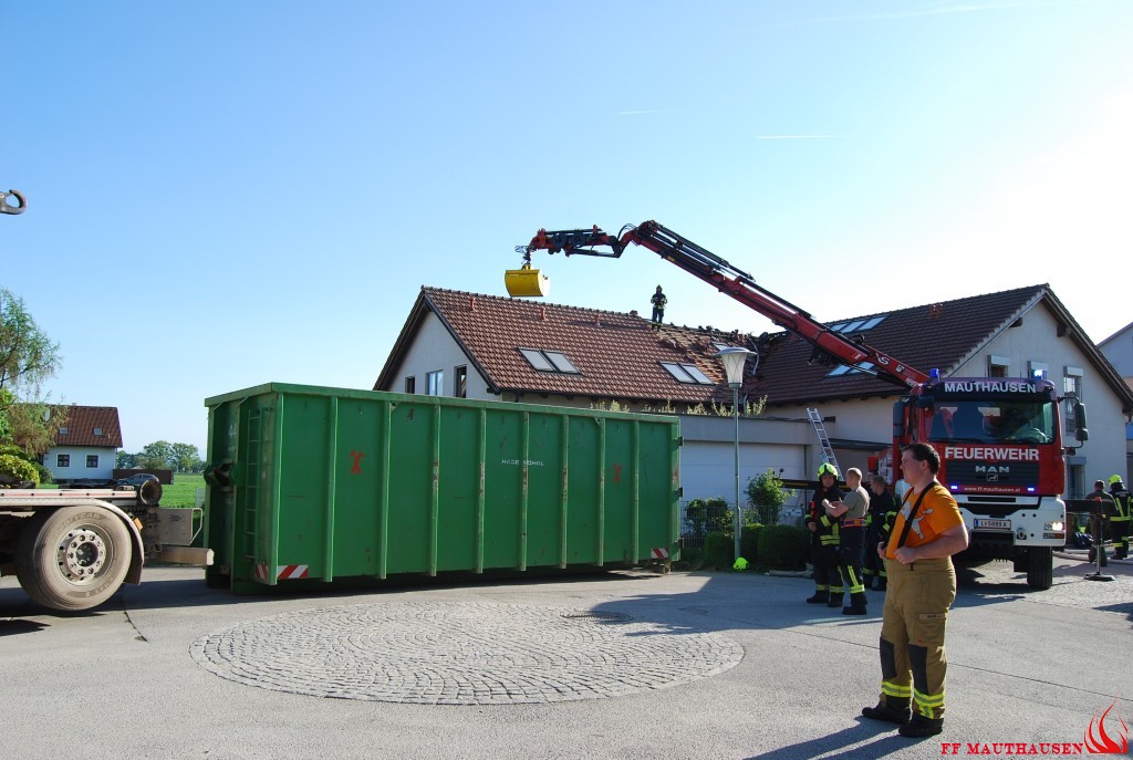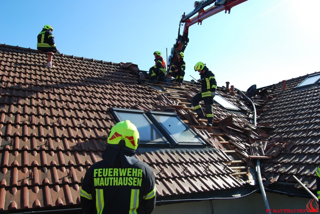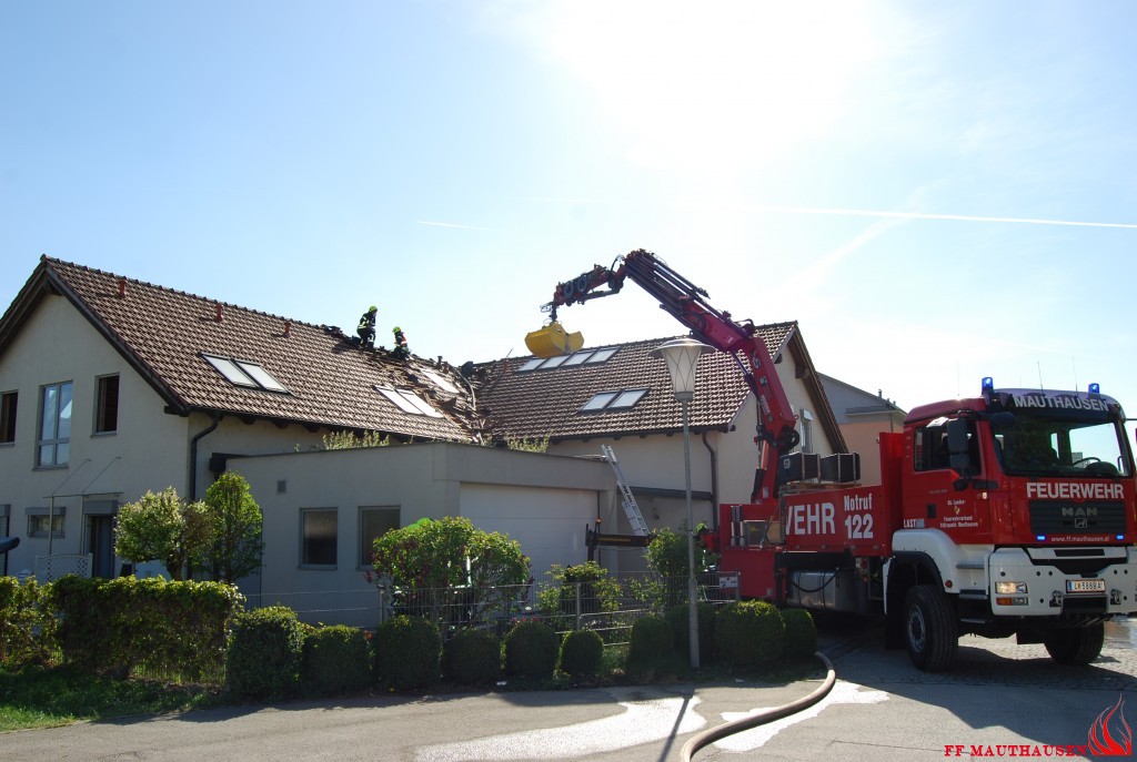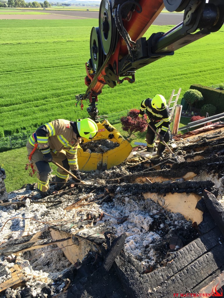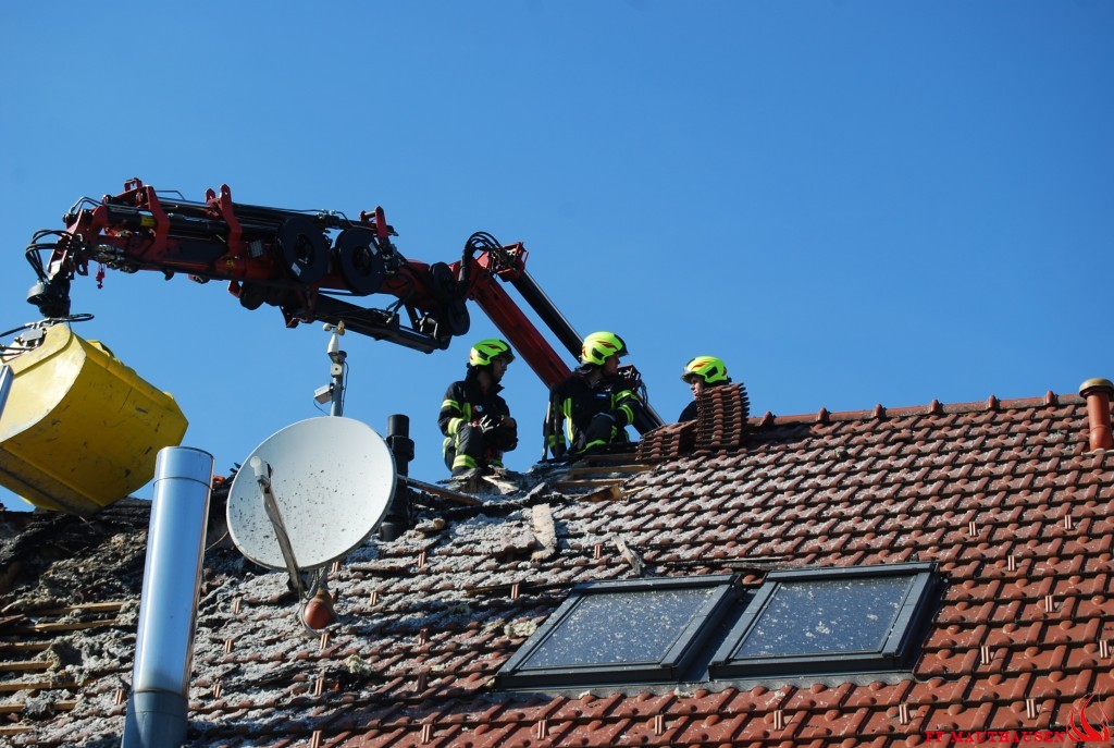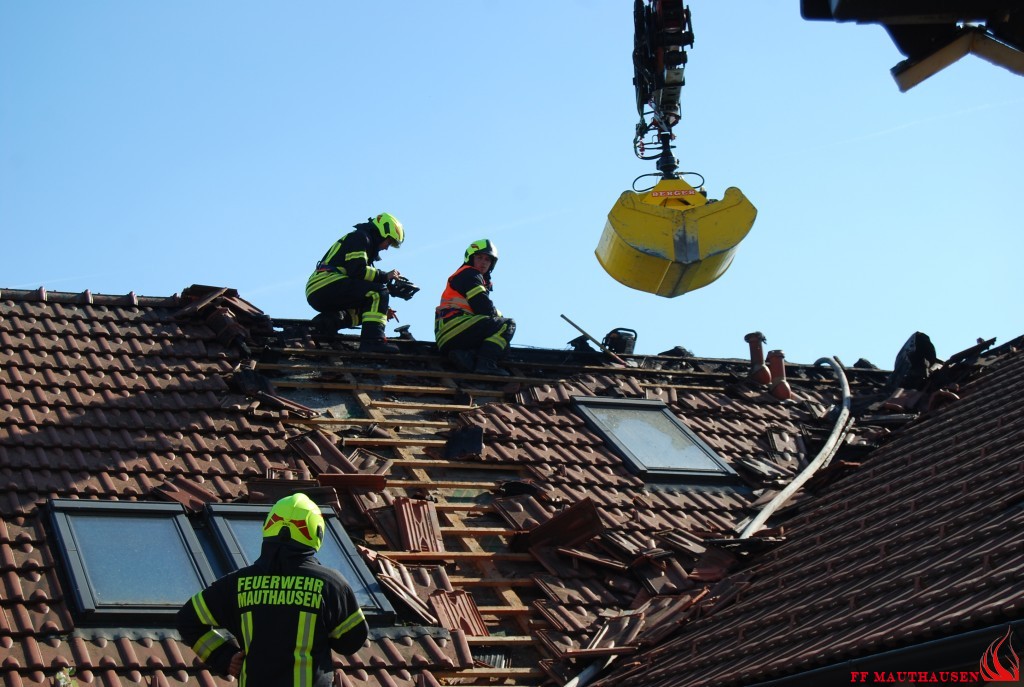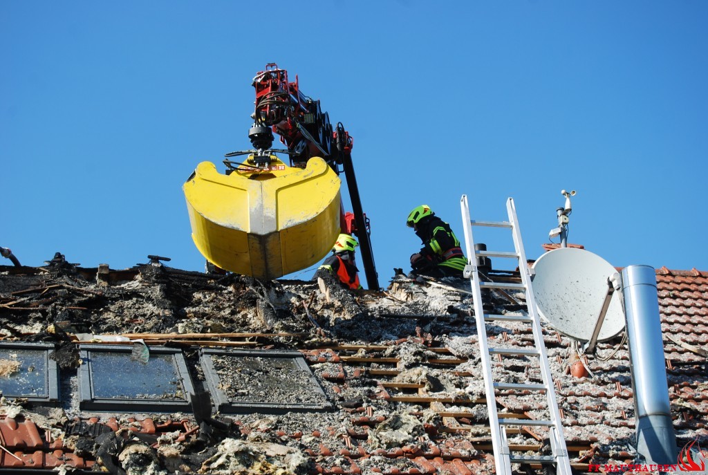 Um das glosende Dämmmaterial, dass sich nach dem Brand noch unter den Dachziegeln befand, zu entfernen wurde das Kran-Stützpunktfahrzeug alarmiert. Nach getaner Arbeit konnte die Einsatzbereitschaft nach rund 5 Stunden wieder hergestellt werden.