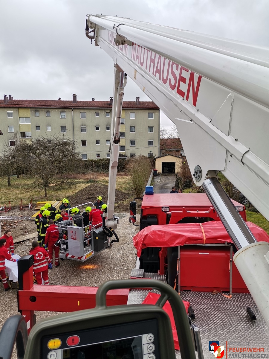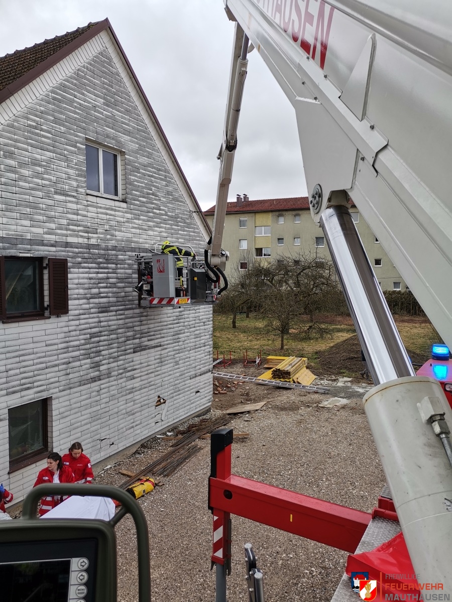 Auf einer Baustelle war es zu einem Zwischenfall gekommen, wobei eine verunfallte Person im Inneren des Hauses schwer verletzt im 1. Obergeschoß zu liegen kam. In Abstimmung mit dem Rettungsdienst wurde eine schonende Rettung mittels Teleskopmastbühne und Korbschleiftrage durchgeführt. Der Verletzte wurde dem zusätzlich angeforderten Notarzthubschrauber Christophorus übergeben und in ein umliegendes Krankenhaus geflogen.