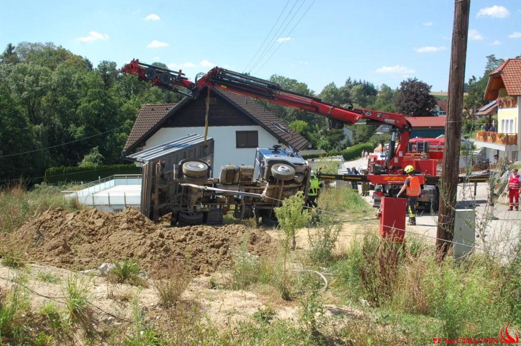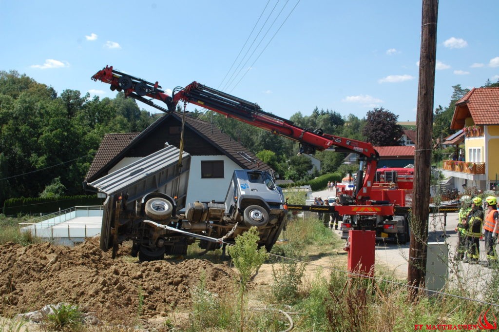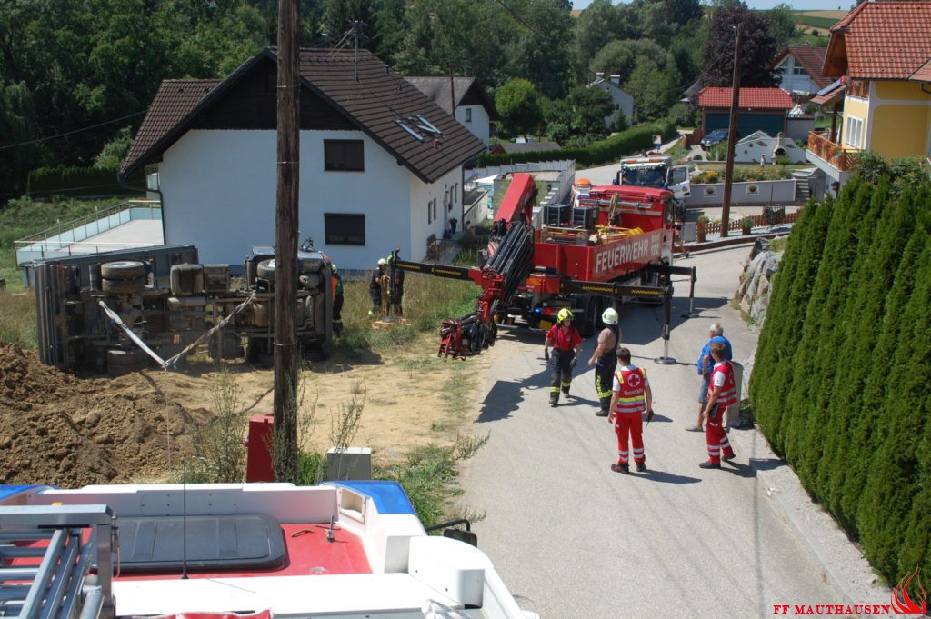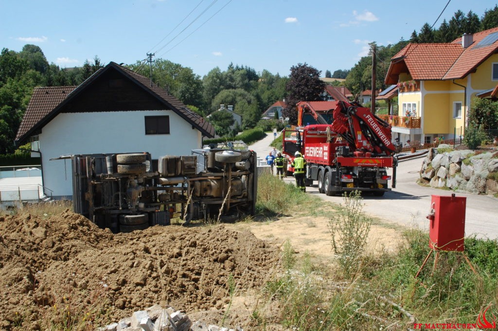 Heute Nachmittag wurde die FF Mauthausen mit den Sichtworten „Verkehrsunfall mit eingeklemmter Person“ alarmiert. Zum Glück stellte sich rasch nach der Ankunft der Einsatzkräfte heraus, dass die Person, welche mit dem Lkw beim Abladen der Erde umgekippt war, sich selbständig aus dem Fahrzeug befreien konnte. Somit musste nur der Lkw wieder aufgestellt werden.