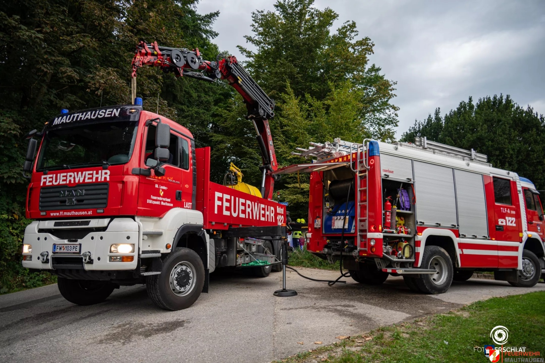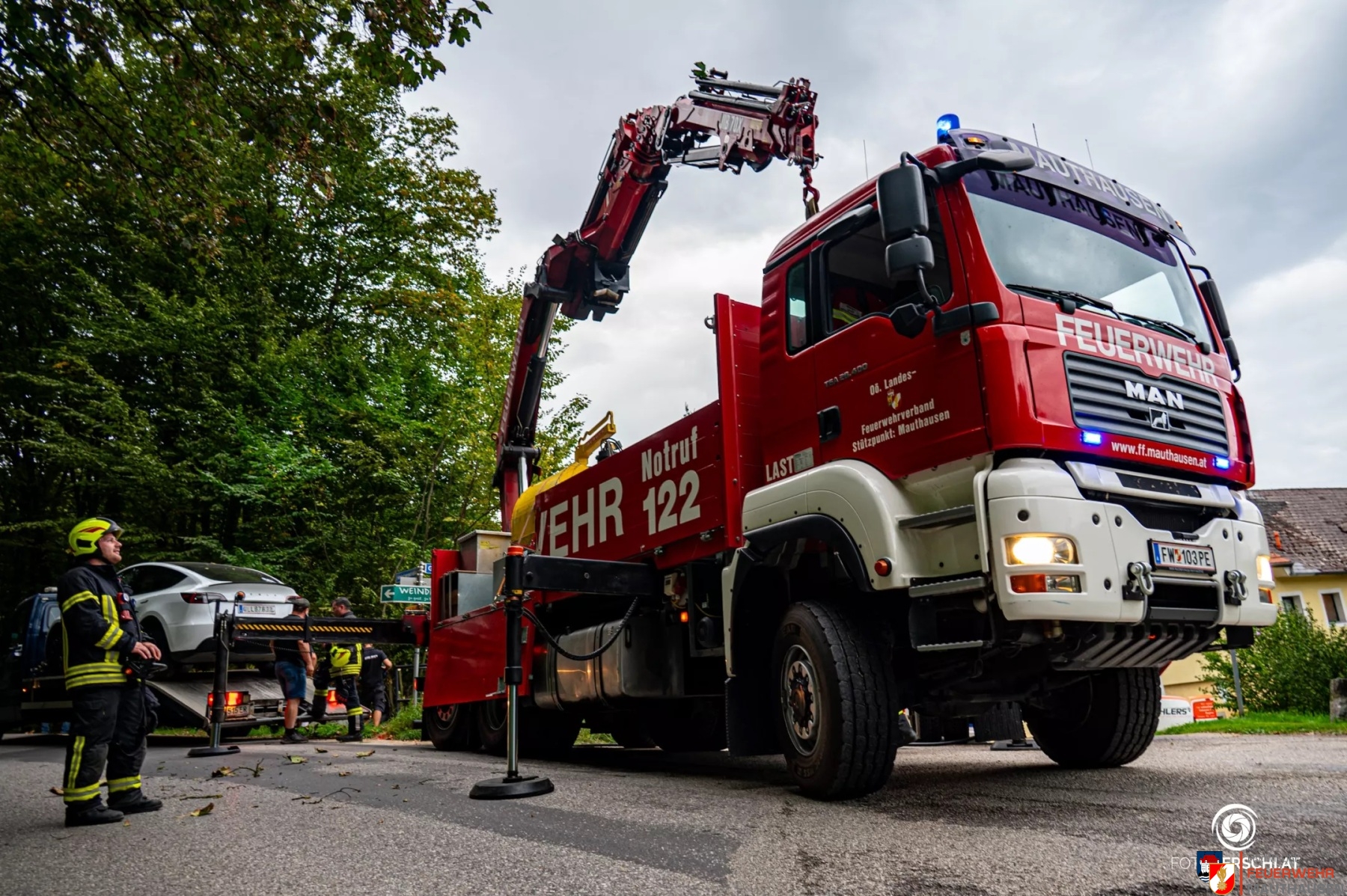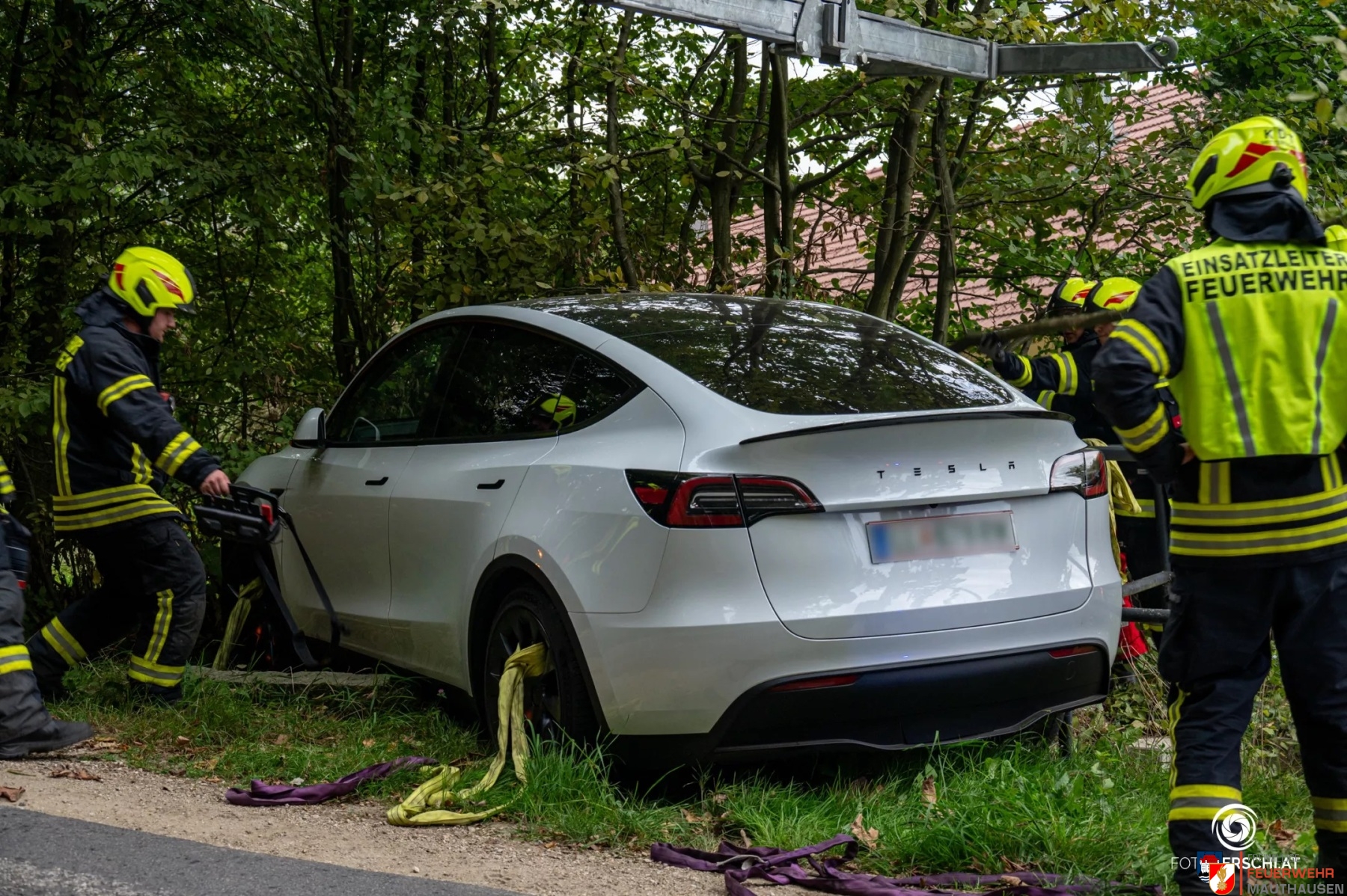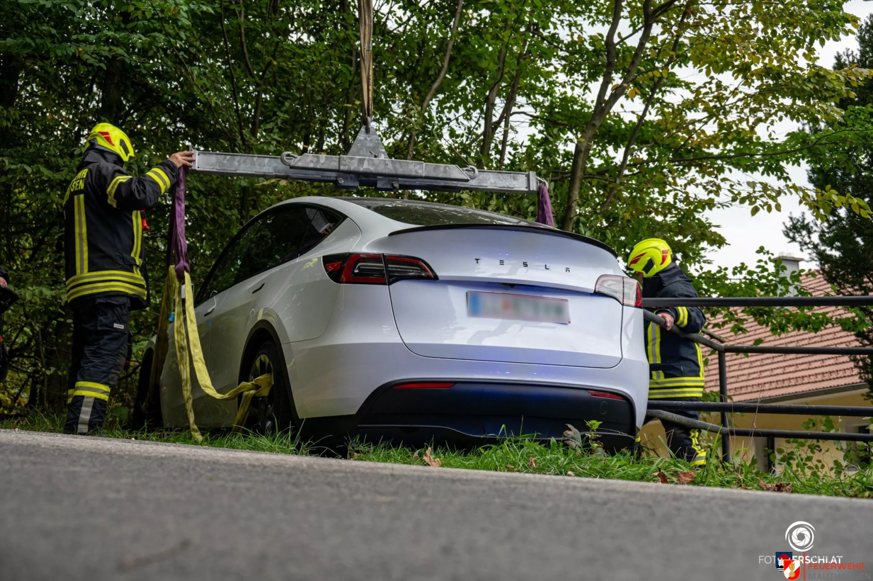 Heute um 17:13 Uhr wurden wir zu einem Verkehrsunfall in den Gutshofweg alarmiert. Aus noch unbekannter Ursache kam ein Lenker mit seinem Elektrofahrzeug von der Straße ab und prallte dabei gegen einen Verteilerkasten unseres lokalen Internetanbieters. Da das Fahrzeug in einem Wassereinlauf und an Bäumen zum Stillstand kam, entschlossen wir uns nach der ersten Lageerkundung für eine Bergung mittels Kranfahrzeug. Um das Fahrzeug ohne weitere Beschädigungen bergen zu können, mussten wir zuerst die dort befindlichen Bäume und Äste mit der Motorsäge entfernen. Das Elektrofahrzeug wurde anschließend mit dem Kran auf den bereits eingetroffen Abschleppdienst gehoben.