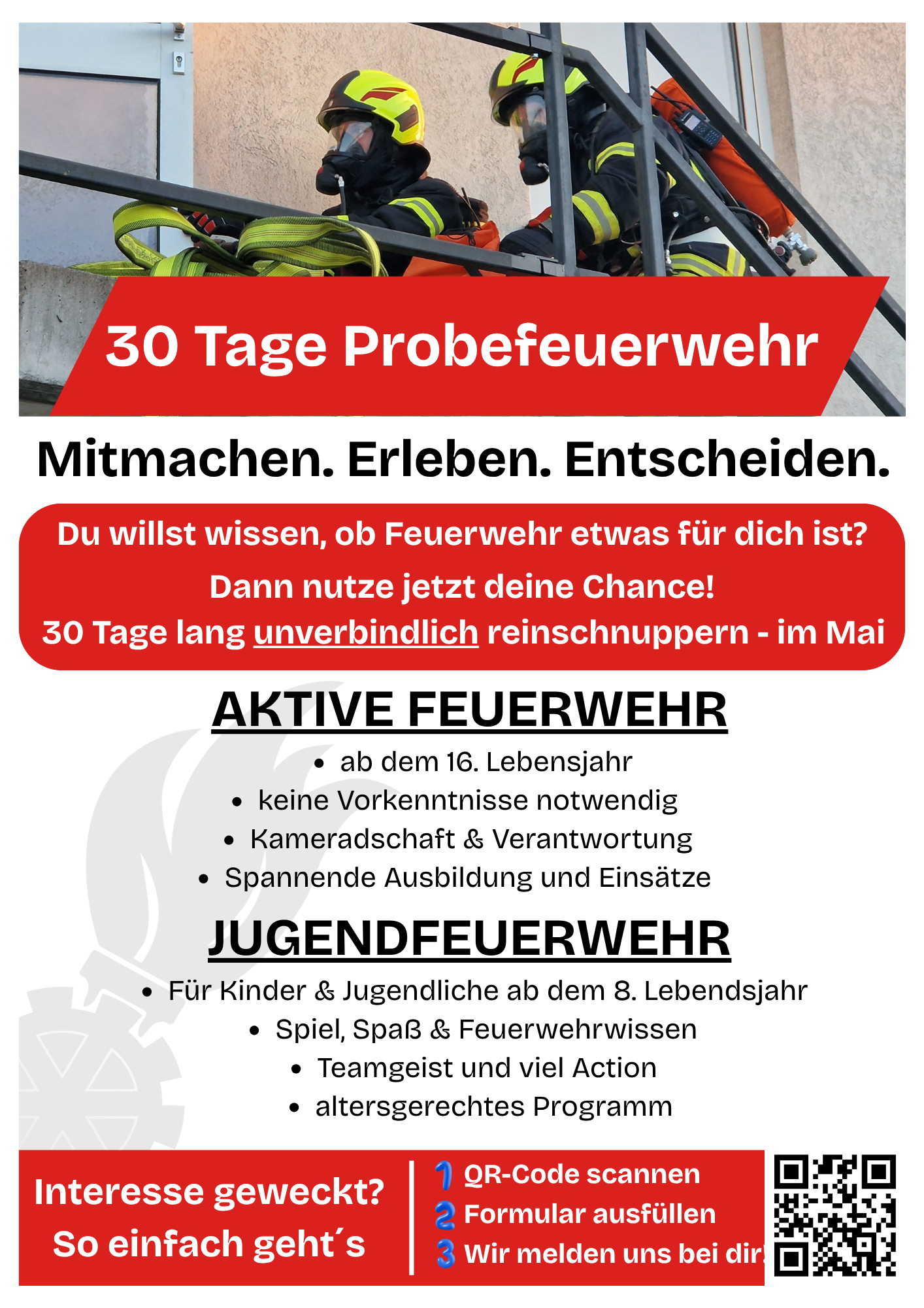 Nutze deine Chance und finde heraus, ob die Feuerwehr zu dir passt – ganz ohne Verpflichtung.