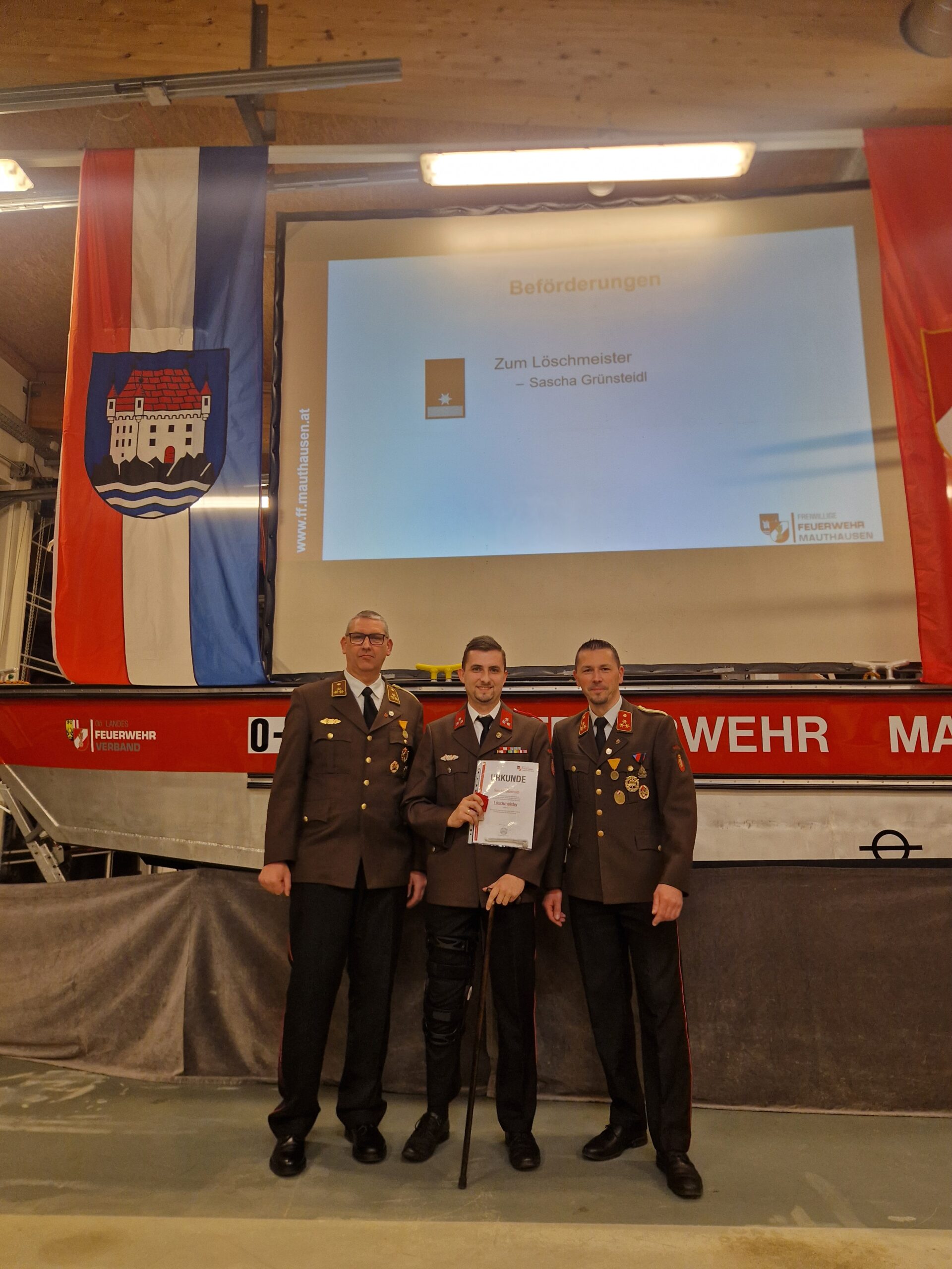 Die Beförderungen umfassten Matthias Burghardt zum Oberfeuerwehrmann, Martin Pilgerstorfer und Matteo Nobis zum Hauptfeuerwehrmann sowie Sascha Grünsteidl zum Löschmeister.