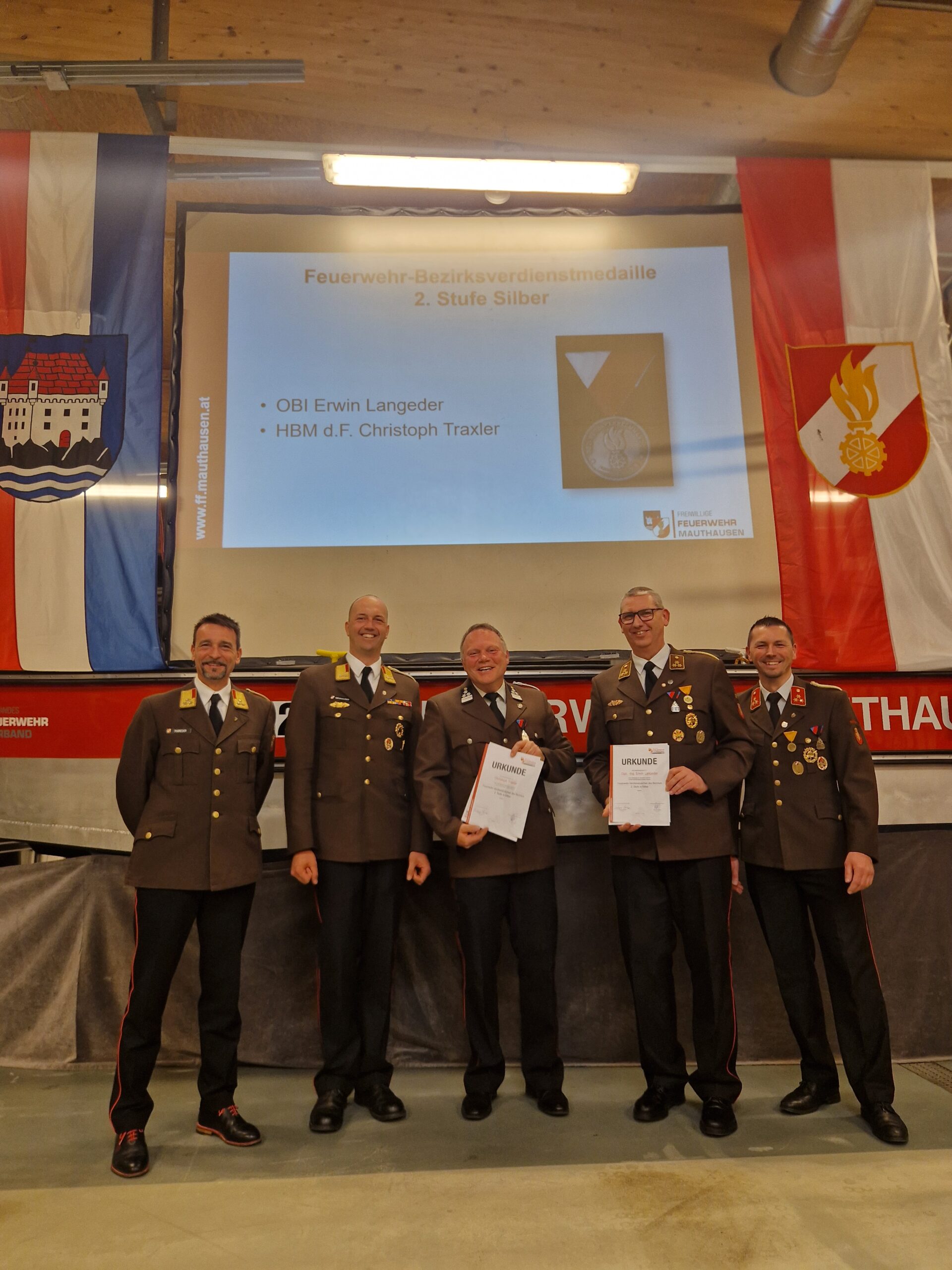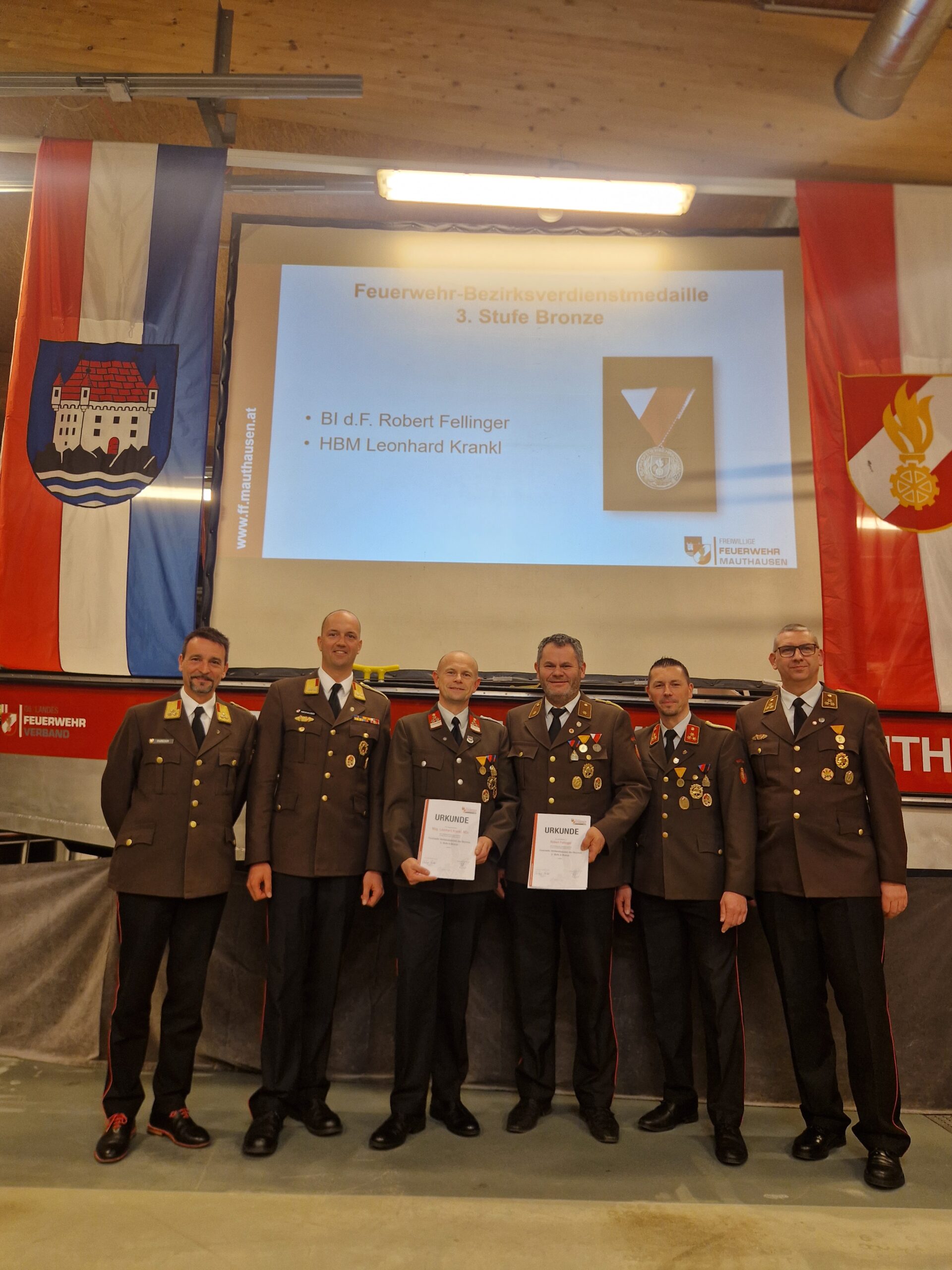 Über die Feuerwehr-Bezirksverdienstmedaille 3. Stufe in Bronze durften sich BI d.F. Robert Fellinger und HBM Leonhard Krankl freuen, während OBI Erwin Langeder sowie HBM d.F. Christoph Traxler mit der Feuerwehr-Bezirksverdienstmedaille 2. Stufe in Silber ausgezeichnet wurden.